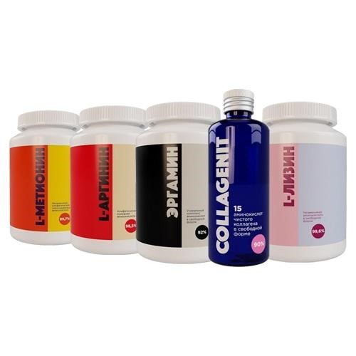 Эргамин (8 гр -16 капсул), L-Лизин (5-7 гр -10-14 капсул), L-Аргинин (4 гр - 8 капсул), Коллагенит (5-10 мл - 10-20 капсул) и L-Метионин (2-3 гр - 4-6 капсул).